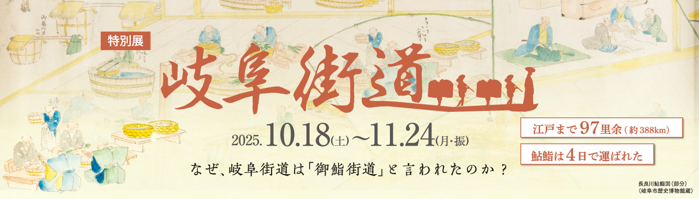 なぜ、岐阜街道は「御鮨街道」と言われたのか?岐阜街道は美濃路の四谷追分(稲沢市井之口)から分かれ、一宮、笠松を通り、中山道加納宿、岐阜に通じる街道です。今回の展示では、岐阜街道の特色を紹介し、この街道が「御鮨街道」と称されるようになった背景に迫ります。